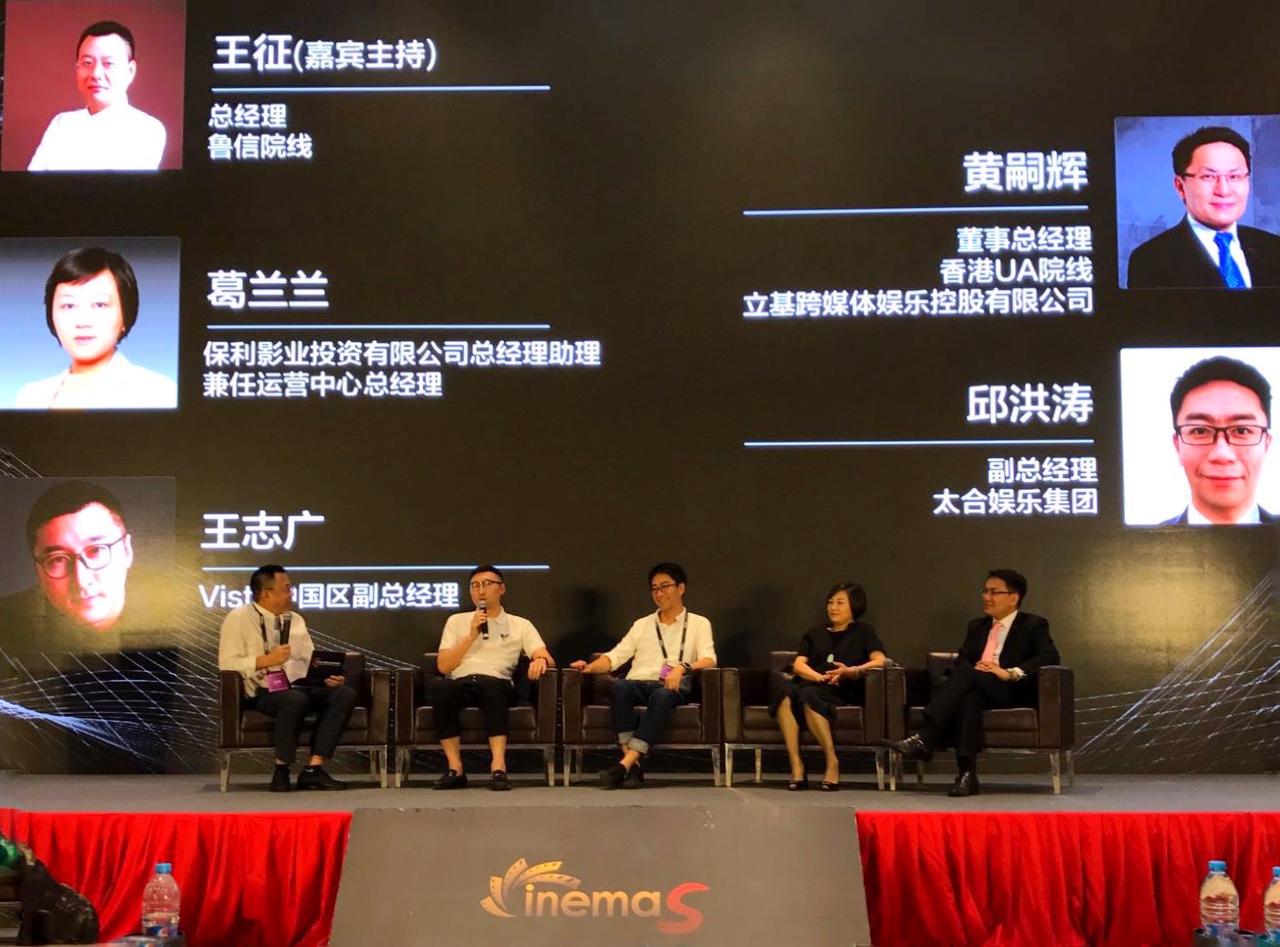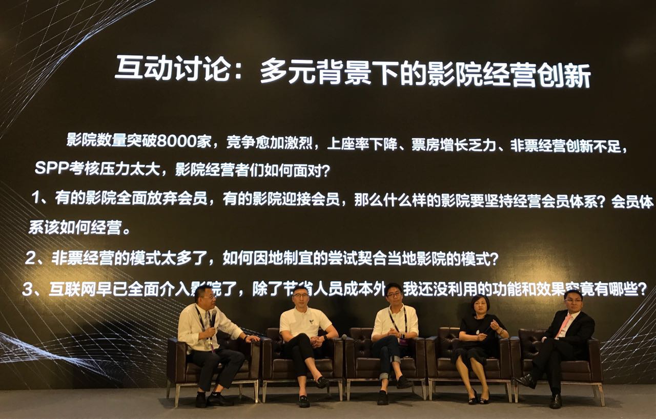 在主题为“多元背景下的影院经营创新”的互动讨论环节中,VISTA中国区副总经理王志广,保利影业投资有限公司总经理助理兼运营中心总经理葛兰兰,香港UA院线、立基跨媒体娱乐控股有限公司董事总经理黄嗣辉,太合娱乐集团副总经理邱洪涛,在鲁信院线总经理王征的主持下,就影院会员体系,非票经营的模式以及互联网介入影院等话题展开讨论。
