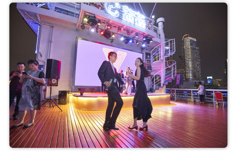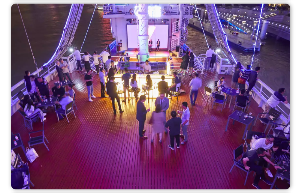 会议过后,游轮驶离港口,在夕阳的黄昏下大家共进晚餐,伴随着乐队的歌声和美酒欣赏夜上海……
