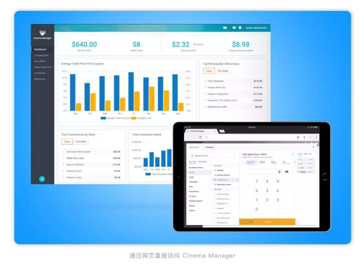 「云端化」是未来影院管理的趋势,而中国更是走在互联网信息化的最前端。VISTA 中国CEO王奂先生就在大会期间重点介绍了国内的云影院计划。首先,Vista 影院管理系统在最新的 5 版本系统升级中,推出了基于网页端的Cinema Manager。您可以使用手机、平板随时随地查看影院运营关键数据,更可以方便快捷地使用拖拽排片功能,简化影院排片流程。