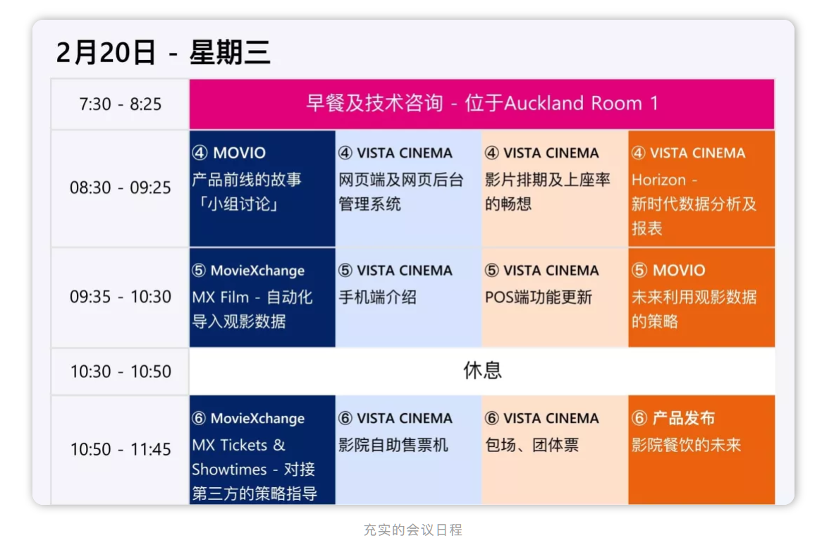 许多议题详细地介绍了如何用VISTA旗下产品,应对全球影院都在关注的热门话题,例如影院餐饮、送餐到座、广告投放、影院数据存储、手机售票、定制化市场营销、订阅服务等等。