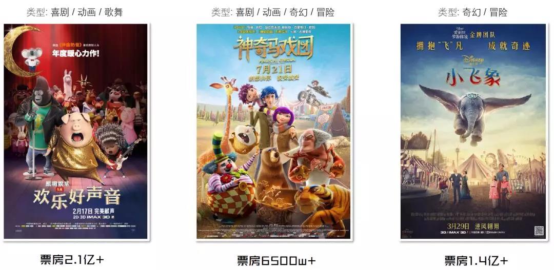 作为一部角色具有较强亲和力的动画电影,我们首先通过对影片类型的分析,我们找到《欢乐好声音》《神奇马戏团》《小飞象》这三部已经上映的「相似类型影片」与《直立象传说》最为相似。