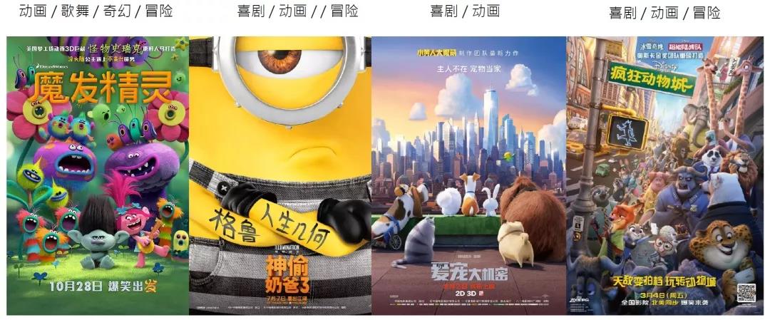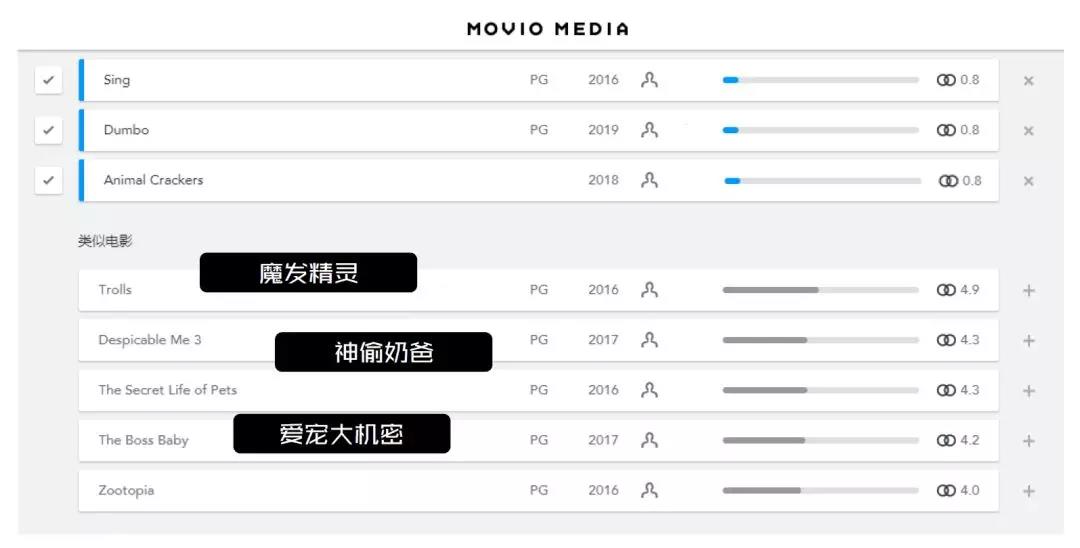 接下来,我们将这三部电影放入 Movio Media 的筛选器中,利用全球影院真实数据,以及影片导演、编剧、主演、类型、用户、票房等多维度算法,寻找到四部「强关联类型影片」:《魔法精灵》《神偷奶爸》《爱宠大机密》《疯狂动画城》。